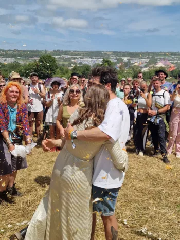 Glastonbury Festival has always been a special place for Tia and Max. They got to know each other there, got engaged there, and – in 2024 – had their wedding ceremony there with the help of a humanist celebrant.